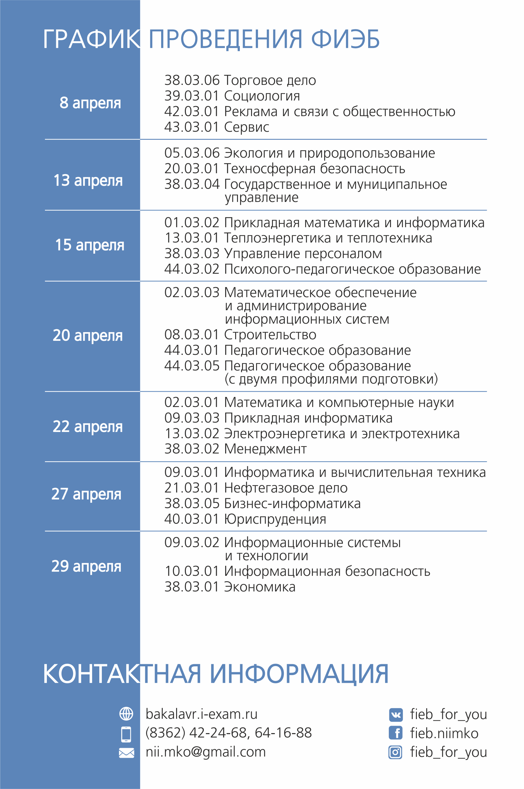 Более подробно с информацией о ФИЭБ можно ознакомиться на сайте проекта, а также скачав пошаговую инструкцию и график проведения. Перед подачей заявки на участие необходимо обратиться в 240 кабинет (корпус «А1» ГАГУ). Телефон для справок 8 (38822) 6-63-95.