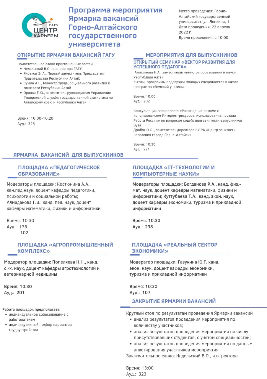 22 апреля 2022 г. в Горно-Алтайском государственном университете состоится «Ярмарка вакансий».