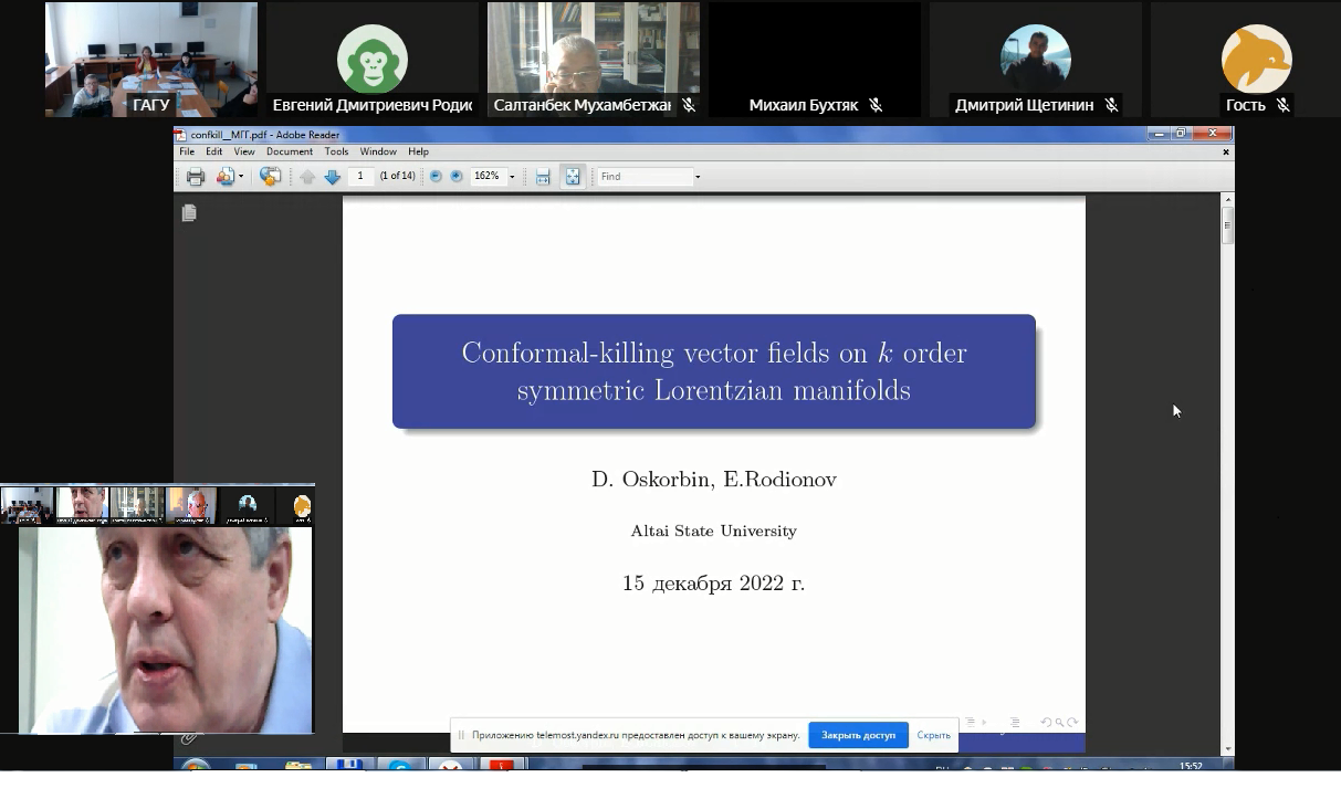 «О конформно-киллинговых векторных полях на k-симметрических пространствах» (Евгений Дмитриевич Родионов, д.ф.-м.н., профессор кафедры математического анализа Института математики и информационных технологий Алтайского государственного университета).