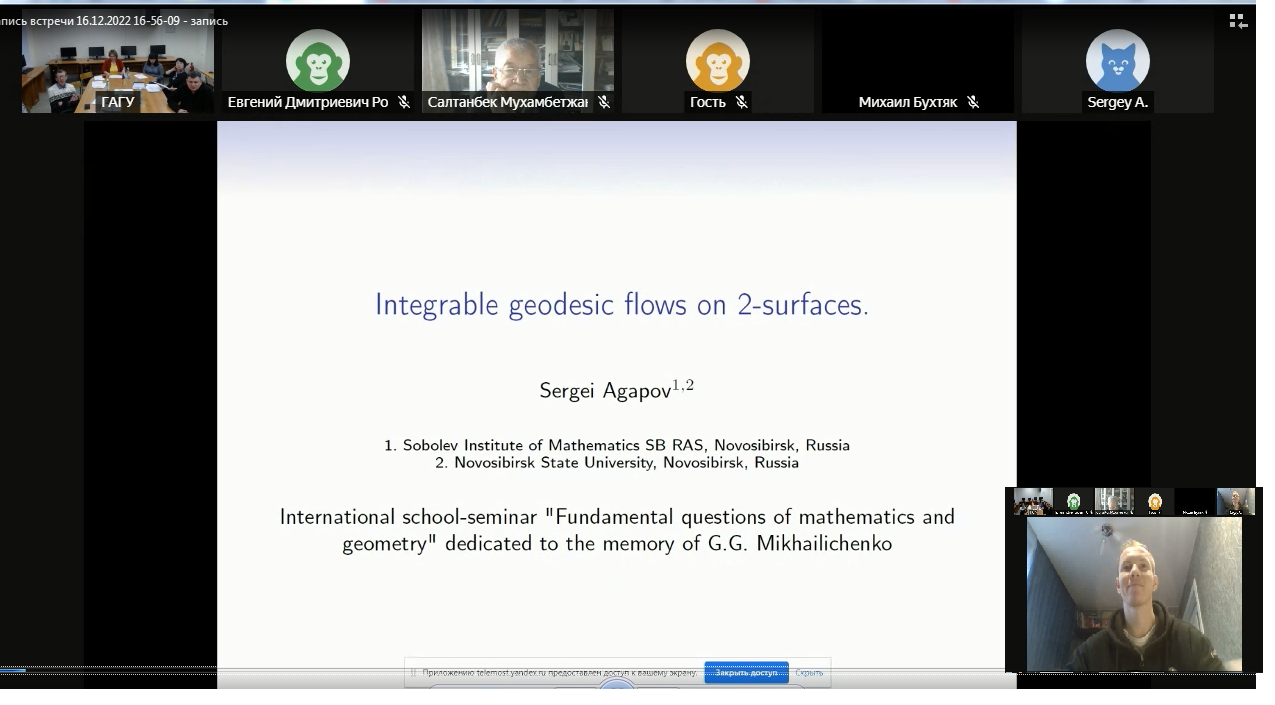 «Интегрируемые геодезические потоки на двумерных поверхностях» (Сергей Вадимович Агапов, к.ф.-м.н., старший научный сотрудник Института математики им. С.Л. Соболева СО РАН),