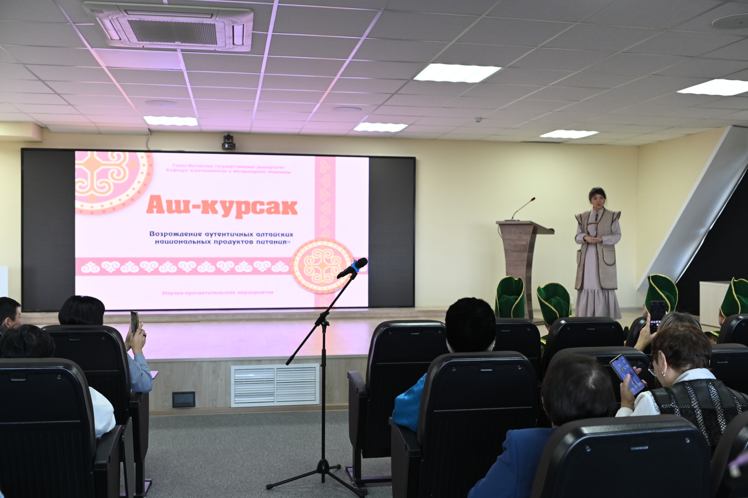 А.Н. Сумачакова, к.с.-х.н., доцент кафедры агротехнологий и ветеринарной медицины ГАГУ, выступила с презентацией научно-популярной лекции «Калаш», основанной на данных многолетних исследований и анализа в области аш-курсака. В докладе впервые была представлена научно обоснованная, систематизированная информация об алтайской хлебной продукции «Калаш» в сопоставлении с нормативно-техническими документами.