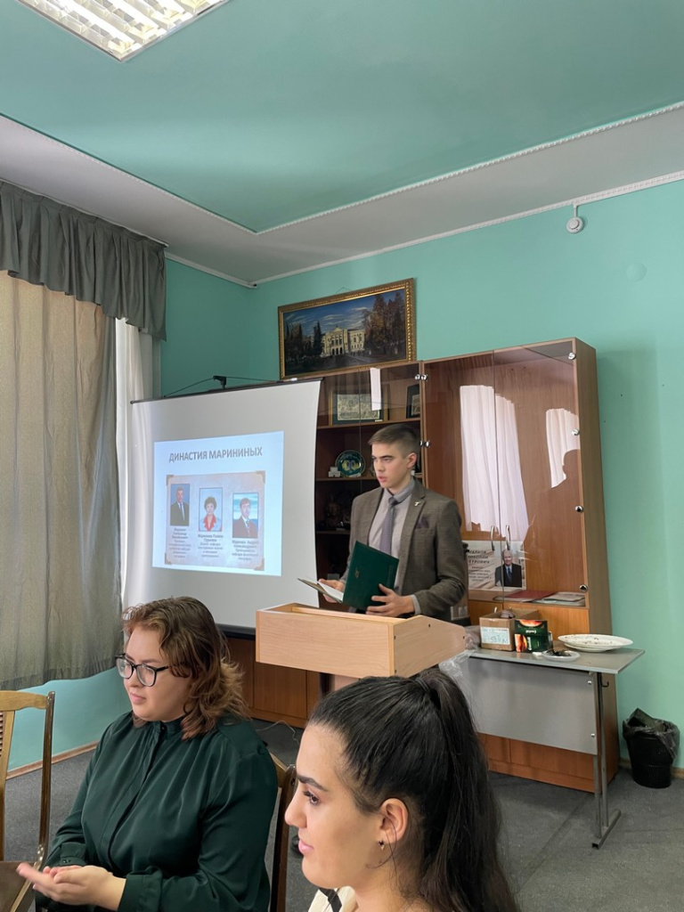 Далее студенты историко-филологического факультета Д. Борбуева, С. Тадыев, И. Пастухов, Е. Болтовский, С. Хансанамян, А. Зырянова поздравили собравшихся музыкально-поэтическими миниатюрами с предстоящим праздником преподавателя высшей школы. Отметим, что студенты 332 группы активно участвовали в подготовке экспозиционного материала и ремонте музея истории ГАГУ, в частности в обработке фотоматериалов большую помощь оказала Л. Буркацкая.