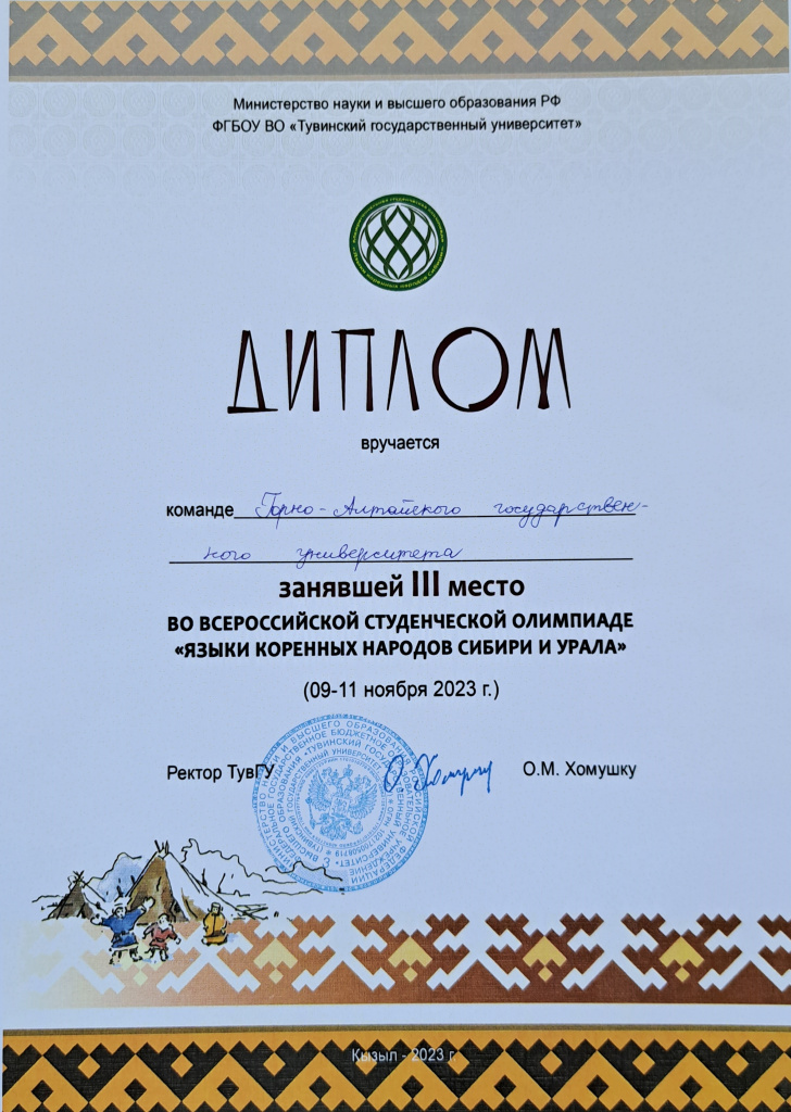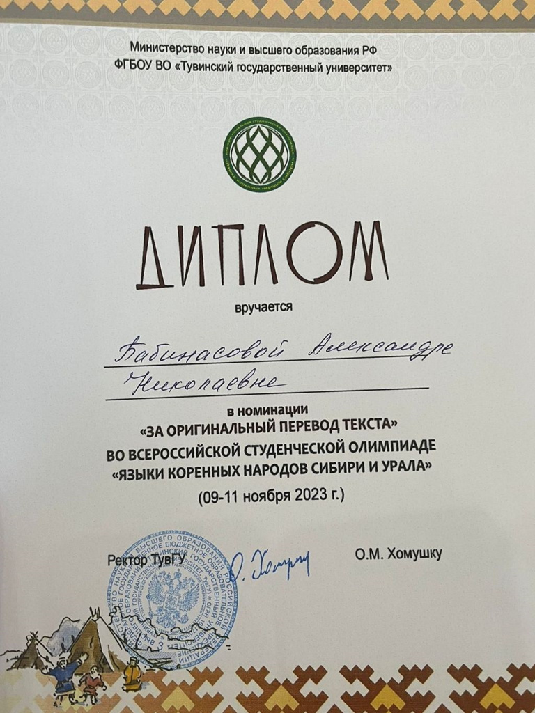 С 9 по 11 ноября в г. Кызыле (Республика Тува) проходила Всероссийская студенческая олимпиада "Языки коренных народов Сибири и Урала". Олимпиада проводилась с целью активизации научного потенциала и взаимодействия студентов различных вузов в области сохранения и развития родных языков, истории и культуры коренных народов Сибири и Урала.