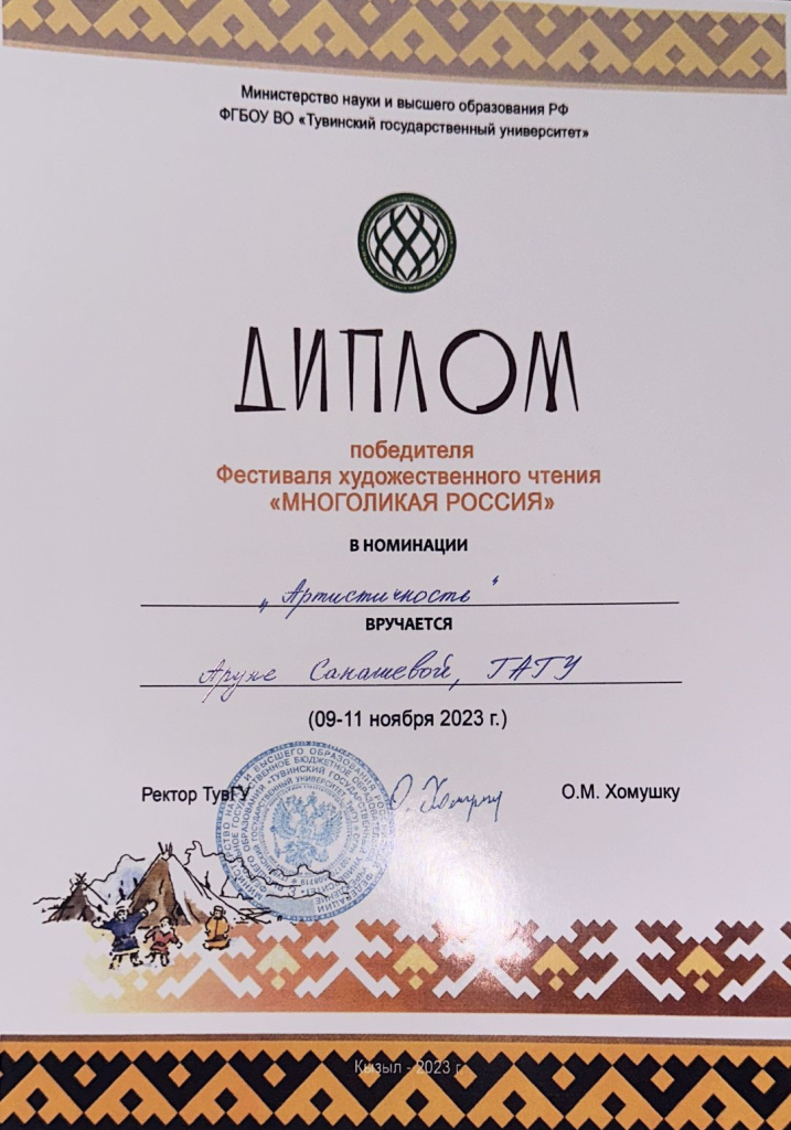 Наши участники продекламировали произведения Л. Кокышева «Алтай уулдарга» («Алтайским парням»), «Ырыс дегени не болотон» («Что такое счастье?»)», «Ундыбагар» («Не забывайте»), Б.Укачина «Кырларда öскöн мöштиҥ бÿри» («Ветка горного кедра»), Д. Моносова «Энемниҥ кару ÿни» («Голос милой матери») на алтайском языке с переводом на русский язык. В результате упорной борьбы дипломом в номинации «За артистичность» удостоена Аруна Санашева.