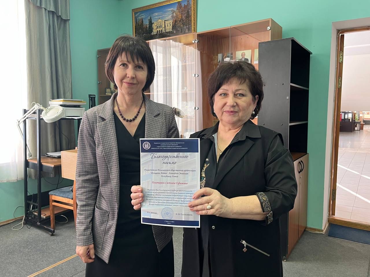 Региональной общественной организации «Женщины Алтая - Алтайдын Эпшилери» Республики Алтай было вручено от университета Благодарственное письмо.
