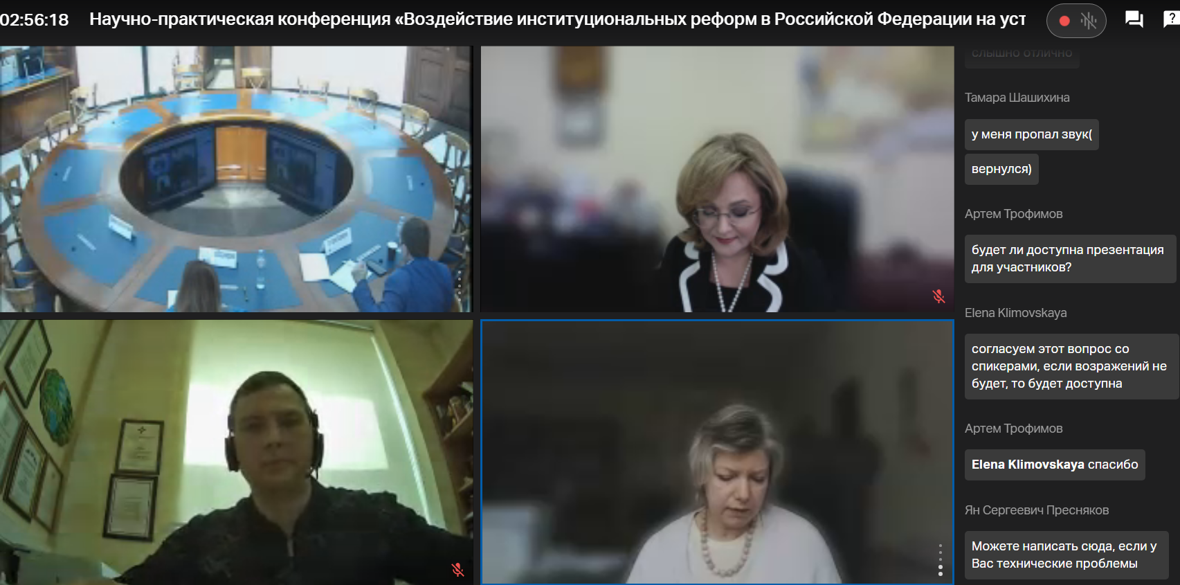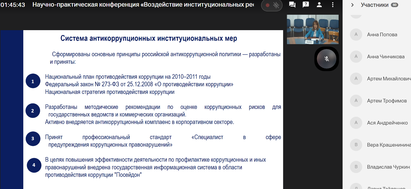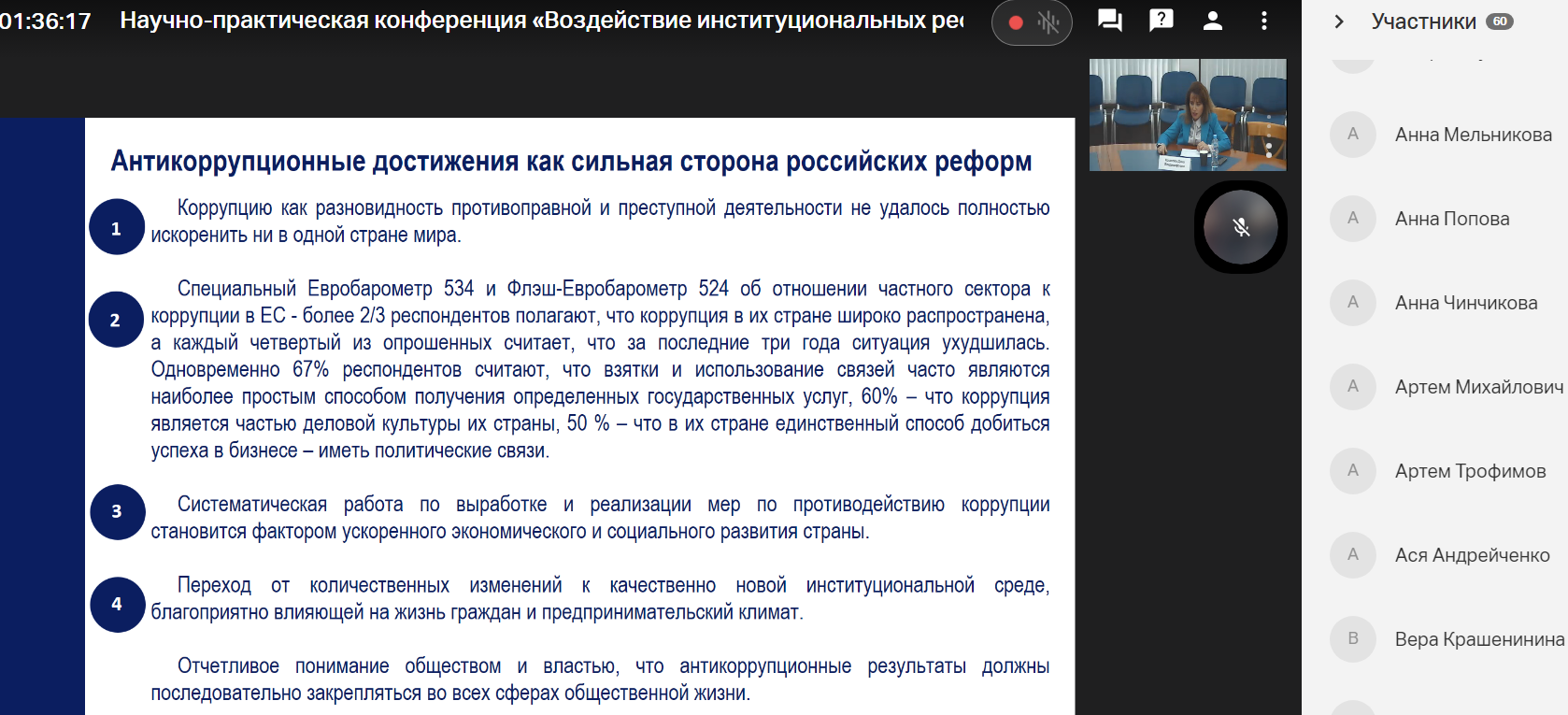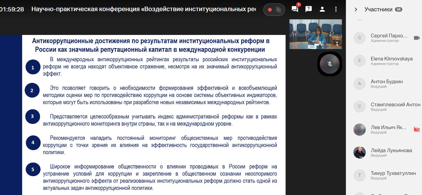 На конференции был представлен тематический доклад НИУ ВШЭ, подготовленный ПУЛАП, и обсуждены вопросы качественных результатов по устранению условий для коррупции вследствие реализации в России институциональных реформ: