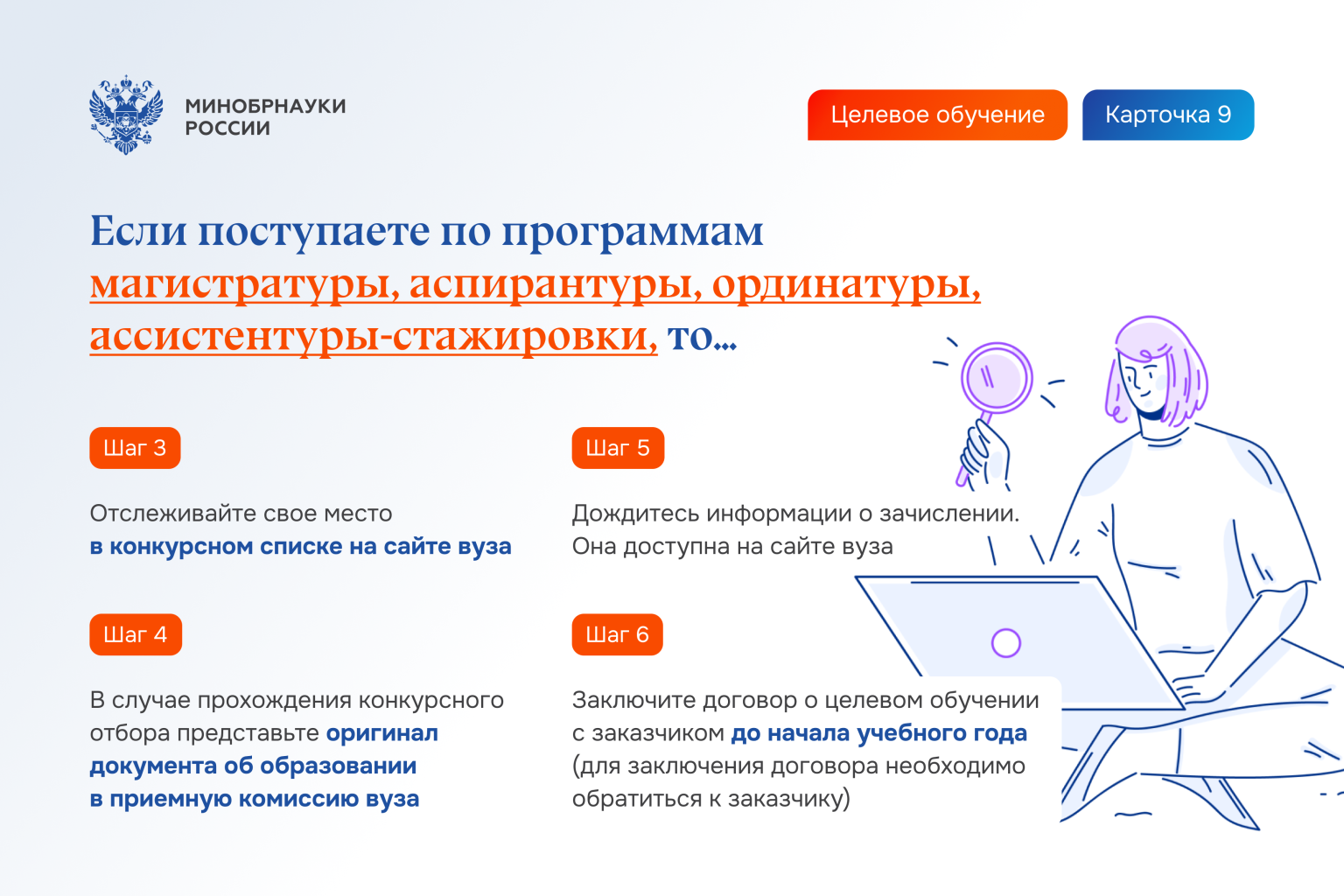 Шаг 8. Заключите договор о целевом обучении с заказчиком не позднее начала учебного года (в электронном виде через приложение «Госключ» или обратившись к заказчику).