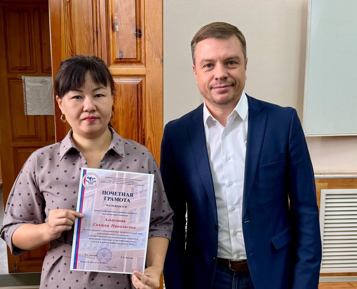 Почетная грамота за многолетний добросовестный педагогический труд, публикационную активность, участие в разработке олимпиадных заданий и проведение олимпиад по английскому языку, участие в работе жюри городского НОУ вручена Саяжан Николаевне Алькеновой.